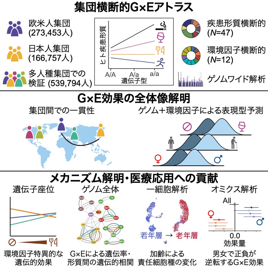 東京大学大学院医学系研究科の難波 真一 助教と岡田 随象 教授らの共同研究グループは、BBJの登録者を含む合計980,004人を対象とした国際的なバイオバンク横断解析により、ゲノムがヒトの個人差に与える影響(遺伝的効果)が、加齢や性別、生活習慣といった環境因子によってどのように変化するか(遺伝子ー環境交互作用;G×E)を網羅的に調査しました。