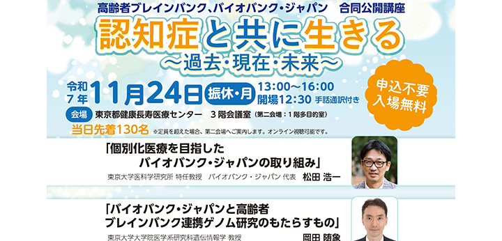[イベント案内] 高齢者ブレインバンク、バイオバンク・ジャパン合同公開講座 「認知症と共に生きる ~過去・現在・未来~」(11/24)